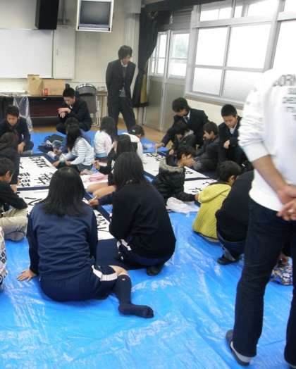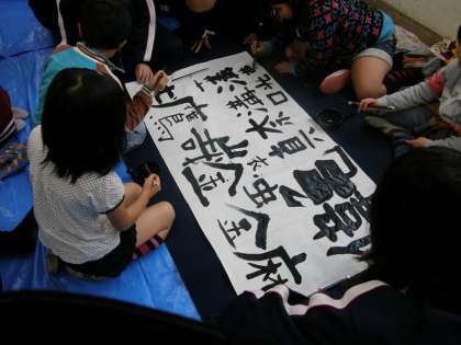 祥栄小学校3年生の児童たちには、「好きな字」を1つ考えてきてもらいました。子どもたちは、高校生にアドバイスをもらいながら、大きな紙に考えてきた文字を書きました。みんな楽しんで書道をしていました。