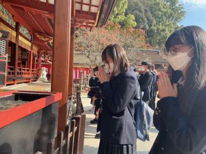 太宰府天満宮は天神さま(菅原道真公)を祀る全国12000社の総本宮で、天神様は「学問・至誠・厄除け」の神様として知られています。少し気が早いですが、来年の受験に向けて合格祈願をしました。参拝後、おみくじを引いてみたり、名物の梅ヶ枝餅を食べたり、参道の土産物屋をみたりして大宰府を満喫しました。