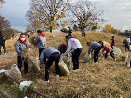 その後,唐橋地区の地元住民の皆さんをはじめ,八条中学校の生徒の皆さん,唐橋小学校の児童の皆さんと共に,唐橋西寺公園の落ち葉の掃除やゴミ拾いなどを行いました。