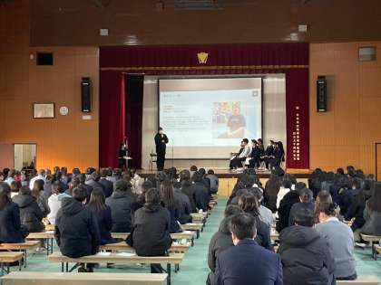 1月20日、塔南高校講堂にて、2年生のキャリア教育を実施いたしました。今回はCMでお馴染みの、ネットショップ作成サービス等を展開しておられるBASE株式会社様から、鶴岡CEOをお招きし、トークセッション形式の講演会を実施いたしました。進行をすべて生徒に任せ、壇上に鶴岡氏と7名の生徒代表を配し、チャレンジ・挫折・発展の3つのテーマについての質問に鶴岡氏が回答するという流れで進行していきました。後半はそのやりとりを見ている会場の生徒たちがフリーで質問する時間を設定いたしました。