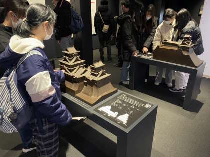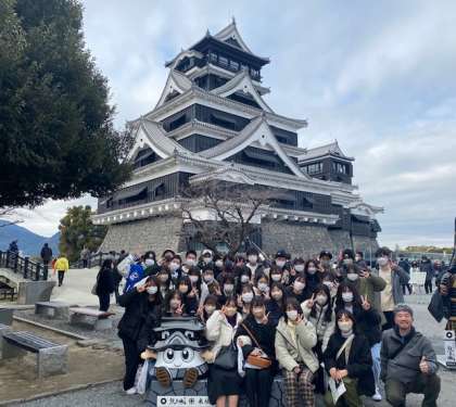 その後熊本城の城彩苑に移動し、お昼ご飯をいただいた後、熊本城の見学を行いました。残念ながら寒波の影響で見学できない場所がありましたが、石垣の武者返しの見学や、城内での展示・解説を通して日本一難攻不落である城と言われる所以を学び感じ取ることができました。生徒たちは「城の迫力を間近で感じれた!」と話していました。また復旧した天守閣からは熊本を眺望することができ、ご当地キャラクターのくまモンの看板を見つけ喜んでいる様子でした。2016年に被災した熊本城は2052年頃に完全復旧される見通しです。いまだに残っている震災によって崩れた瓦礫などを見て、当時の被害の大きさを感じたと共に、今しか見ることのできない熊本城を見学でき、貴重な体験となりました。
