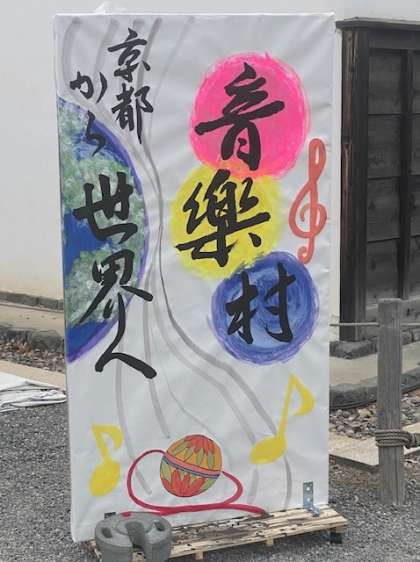 しかし、世界遺産の二条城で墨が飛び散ってはいけないとのことで、パフォーマンスはできないとのこと、代わりに、音楽村の入場口に設置する看板を制作してほしいとなり、看板制作で参加をさせていただきました。