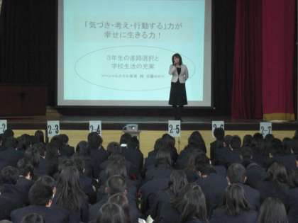 2月22日、6・7時間目 2年生全員を対象に特別授業「キャリア講演会」を実施しました。講師の先生からは、「人生には苦しいことがたくさんありますが、『気づき・考え・行動する』力を持つことで幸せに生きていくことができる」というメッセ