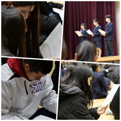 1月31日(水)7限、唐橋校地アリーナには開建高校1年生と塔南高校2年生が集い、生徒集会が開催されました。議題は未来協創会議及び生徒会執行部提案による「塔南高校生徒心得」改定に関する学校への要望書についての話し合いと議決です。