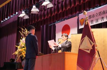 柔らかな春の息吹が満ち、躍動の気配を漂わせる今日の佳き日に、京都市立塔南高等学校第61回卒業証書授与式を挙行するにあたり、御来賓として、京都市教育委員会生徒指導課首席指導主事 徳地 守 様、本校学校運営協議会理事長・唐橋自治会連合会会長 天野 広一 様をはじめ、愛校会会長様、PTA役員の皆様、保護者の皆様方の御臨席を賜りまして、心から御礼申し上げます。
