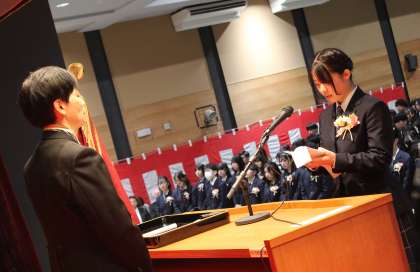さて、卒業生の皆さん、いよいよ本校を巣立つときが来ました。これらの未来社会は皆さんの力を必要としています。そして、皆さんが未来社会を創っていくのです。本日、本校の校門を出て、素晴らしい人生に繋がる道を、胸を張って進んでください。卒業生の皆さん一人一人が、それぞれの世界に向けて力強く旅立ち、それに続く輝かしい未来が訪れることを願いまして式辞といたします。