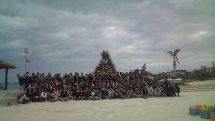 2年生の一行は、何とか晴れ間ののぞく中、マリン体験を行い、午後から「美ら海水族館」へ行きました。そのあと読谷村の入村式を終えて、先ほど、迎えに来ていただいた村の方々とそれぞれのお世話になる民泊先へ向かいました。写真は、マリン体験の前にみんなで撮ったものと入村式の様子です。