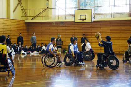 11月14日(木)人権学習が行われました。1、2年生は平和学習でビデオを鑑賞しました。3年生は体育館にて、車いすバスケットの選手と交流を行いました。生徒たちは実際に体験し、その後、選手の方からお話を聞きました。