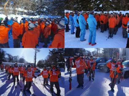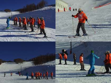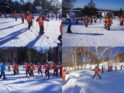 普通科1年生は、6台のバスに分乗して京都駅を出発、無事に目的地である白樺高原スキー場へ到着しました。昼食後に早速、開校式。研修旅行委員長が力強く決意を述べ、講習がスタートしました(写真1枚目)。スキー経験の少ない班は、まずはゲレンデの下でスキーに慣れることからスタート。それでも2時間の講習で、一人で滑れるまでになりました(写真2枚目)。一方、中級班は、早速リフトに乗って中腹からレッスン開始。気温は氷点下ですが、雲一つない青空のもと、最高の雪質に恵まれて、どんどん上達しているようです(写真3枚目)。このあと今夜は、ホテル内の6会場に分かれてのクラスレクリエーションが予定されています。
