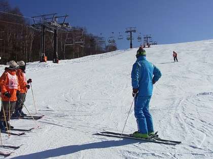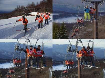 午前中に人生初めてのリフトを経験した初級班は午後になるともう1本リフトを乗り継いで、とうとうゲレンデ最上部までやってこられるようになりました。ここから約5kmの林間コースが本日のメインイベントです。