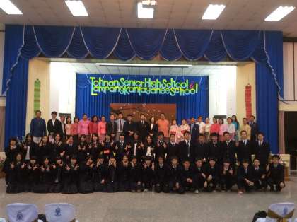 今日でタイ研修旅行も4日目、今日はエレファントキャンプに行ったりして一日ホストファミリーと過ごします。そして夜には交流ディナーパーティーがカラヤニ校で行われます。下の写真は昨日カラヤニ校を訪れた際の歓迎の様子です。もうホストファミリーと過ごすのも今晩限りとなります。