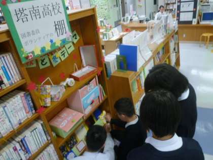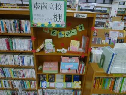 本校の東館の1階には、京都市立吉祥院図書館があります。以前より美術や書道の生徒作品を同図書館に展示していただいています。そして現在、図書館の一角に塔南高校のコーナーを設けていただき、本校図書委員5名が作成したおススメ本の紹介が手作りのイラストとともに飾られています。楽しく読める工夫が凝らされていますので、ぜひご高覧ください。