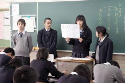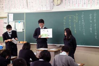 生徒たちは班ごとに,分担した本文の内容について,自分たちで考えた小見出しを付け,重要古語の意味や本文のあらすじを押さえながらストーリーを紙芝居にまとめ,高校生らしい現代語訳をつけて発表し,教室は大いに盛り上がりました(写真左,中)。発表が終わると,古語の意味や何故そのような解釈になるのかといった質疑応答があり,その後,紙芝居の活用や本文の活用,役割分担の3つの評価項目について評価シートに記入しました(写真右)。