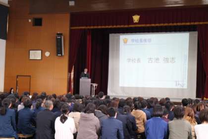全体説明会では、校長あいさつに引き続き、新1年学年主任が「皆さんは“大きな子ども”ではなく“小さな大人”です」と力強く語りかけ、基本的な生活習慣として、「夜寝る時間」「朝起きる時間」「勉強を始める時間」の3点を固定することを呼びかけました。