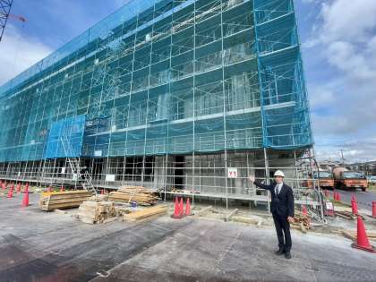 現在、新校地の校舎等の建築工事(下記の写真参照)も順調に進んでおり、来年の夏頃には新校舎が完成し、新校地での教育活動がスタートしていくこととなります。新たな学びの空間L-pod(ラーニングポッド)をはじめプレゼンテーションルームやアリーナ、地域協働スペースを有した図書館、カフェテリア等、特色ある施設・設備が完備されます。新校地で充実したすばらしい高校生活を共に過ごしていきましょう!
