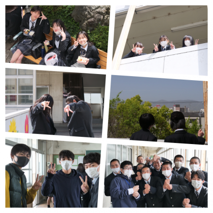 行事日以外は私服も可能な一年生の教室ではダウンの生徒もパーカーの生徒も学校服の生徒も。それにしても野球部の一年生は休み時間も元気ですね。先生も引き込んでノリノリです。