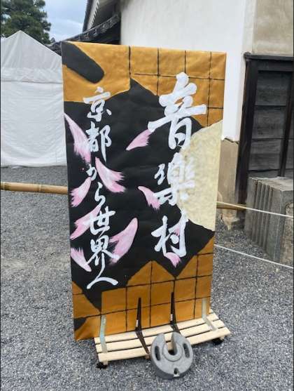 しかし、世界遺産の二条城で墨が飛び散ってはいけないとのことで、パフォーマンスはできないとのこと、代わりに、音楽村の入場口に設置する看板を制作してほしいとなり、看板制作で参加をさせていただきました。