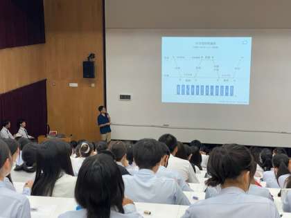 先端理工学部の 川上竜樹 教授からは教科の理解を深めるとものの見方や考え方が変わること、数学が理系の言語であることなどのお話をいただき、生徒の理系の科目に対する考えを深める良い機会となりました。