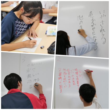 教員は生徒の記入した壁をつたいながら、生徒の意見に解説を加えていきます。さらに深まった理解をもとに、言語文化への関心を高めていく授業を心がけています。