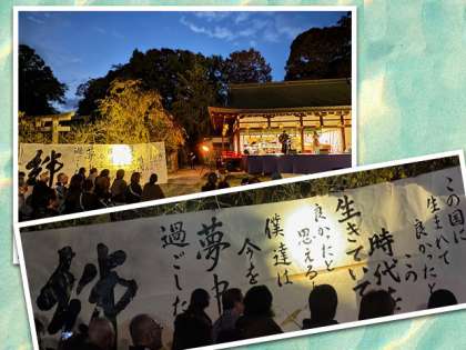 5日の夕方には、北野天満宮紅梅殿でメインコンサートが行われ、書道部が組曲「西陣」(総合プロデューサーである大森さんの作曲)のフィナーレの部分の歌詞を揮毫し、披露しました。最後の盛り上がりの場面で、書道部の書が出てくると観客の視線が舞台から所に移り、たくさんの方が写真に撮られていました。