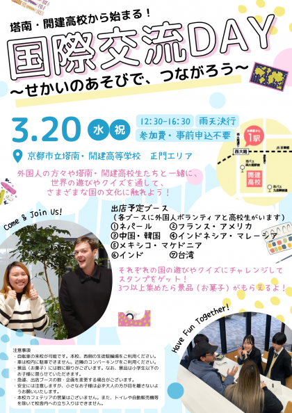 3月20日(水・祝)12:30〜16:30に塔南・開建高校の校門入ったすぐの場所で「国際交流DAY」を開催します。このイベントでは、外国人ボランティアスタッフや京都市のALT、そして塔南・開建生が協力して、子どもたちが楽しめる色々な国の遊びや踊り、クイズなどを企画しています。挑戦していただくとスタンプがもらえ、スタンプを3つ以上集めるとおやつがもらます。(小学生以下のお子様限定)申し込み無料、参加費無料です。遊びを通して、色々な国の人と交流しましょう!詳しくはチラシをご覧ください。