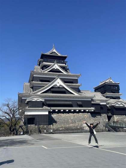 震災の跡を少し残しつつも壮大な迫力と強さを感じる熊本城にて、歴史や迫力を感じている班などを始め、各チーム熊本各地を巡り熊本を感じています。