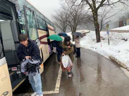 「村」コース 天気は雨ですが金沢へ向け予定通り出発しました!! 昨日雪かきの延長でかまくらを作った子達もいます!
