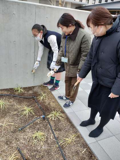 ここからは、校舎東門付近の1区画を「実験区画」としてお借りし、グラウンドカバーとなる植物の試験的育成などに取り組んでいきます。