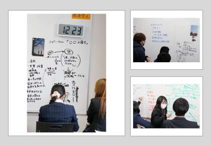 昼からは、写真のコピーライトを6枚それそれに分かれて考えるチームと、報告会のプレゼン内容を考えるチームに分かれて作業を進めていきました。コピーライトを考えるのは簡単ではなく、短い言葉でいかに写真に想いをのせるのかを考えていました。何度もアイデアが没になり落ち込んでいましたが、最後に最高のコピーライトができたときの喜びはひとしおでした。