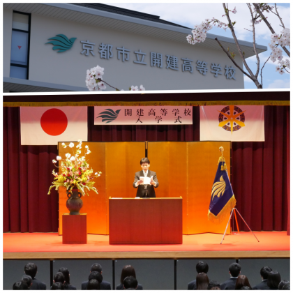 時はまさに春の訪れを告げている本日の良き日に、御来賓として、京都市教育委員会学校指導課指導主事 坂井 美保 様、本校学校運営協議会理事長・唐橋自治会連合会会長 天野 広一 様をはじめ、愛校会会長、PTA役員の皆様の御臨席と、保護者の皆様の御来校を賜り、京都市立 開建高等学校 入学式を挙行できますことはこのうえない喜びであり、心より感謝申し上げます。