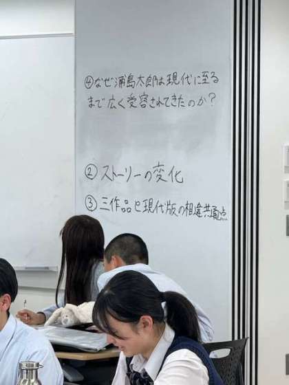 生徒は3人のグループになり、日本書紀の浦島太郎から、各年代の浦島太郎を読み、現代の浦島太郎との共通点や相違点を探し(コアスキル『比べてみる』)、変遷をたどり(コアスキル『さかのぼってみる』)、その違いに驚いたり、なぜこんなに変わったのかと問いを深めていました。