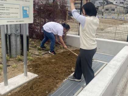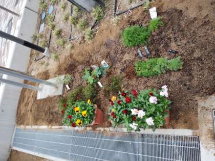 3月の土壌調査を踏まえ、校舎東門付近の1区画を「実験区画」を耕し、腐葉土や元肥を入れて、そこにあらかじめプランターで育てておいた植物を植え付けました。