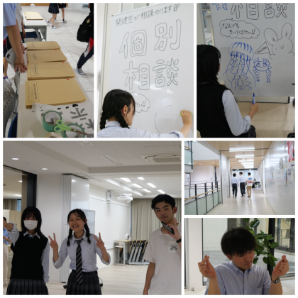 絵の好きな人はお迎えボード。去年に発表を行った2年生は今年は全体の司会、画像・映像編集の達人はPPTの作成、と準備にいそしみます。L-pod教室の中は冷房が利いていて快適ですが、廊下は暑い。ということでシンプルに扇風機が登場すると、やっちゃいますよね。「あ"〜〜〜〜」さて、