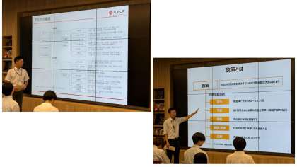 次に山口参事官補佐より、ご自身の文部科学省での9つの経歴を踏まえ、国家公務員の仕事についてお話をいただきました。元々民間商社で働いておられ、様々な職種を経て文科省に入省された経歴は、生徒たちにとって国家公務員のイメージを更新させるものであっと思います。生徒の「一番やりがいのあった仕事は?」の質問には、「文科省での仕事はほとんどがニュースなりやすく影響力の大きい仕事のため、すべての仕事にやりがいを感じた。と同時に、緊張が強いられるものだった」と答えていただきました。特に東日本大震災時の経験により、国家公務員は「全体の奉仕者である」ことの意味を実感することができ、政策を実行する相手の顔が見えているか、自分の考えをもつことができるかを常に念頭に置き仕事をしているとことでした。