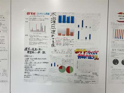 「実際に、測ってみた」とは、仮説探索のための1次データ収集をし,そのデータから見えざる原因を予想・考察し,仮説検証のための1次データ収集を行うことで,データ収集スキルの基礎とデータから原因を予測することの良さを学ぶ授業になります。全5回の授業で構成されており、今回仮説検証の結果・考察等をポスターにまとめて廊下に掲示しました。