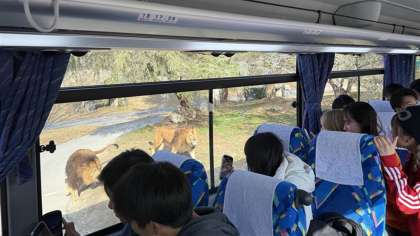 バスに乗ったままサファリの中を進むと、ライオンやシマウマ、キリンなどの野生動物が目の前に現れ、その迫力にみんな大興奮でした。動物たちが自由に歩き回る姿を間近で見ることができました。また、シタツンガやムフロン、ローンアンテロープなど、ここで初めて出会った動物も多く、その姿に興味津々でした。特に、ライオンがバスのすぐ側まで近づいてきたときは、思わず声を上げる生徒も多かったです。