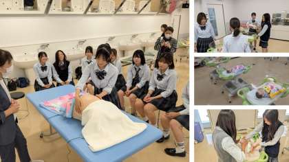 佛教大学二条キャンパスにて、看護学領域について学ばせていただきました。母性看護(妊娠・出産を通して生命の誕生について考える)をテーマに講義していただき、実習室 にて妊婦体験、胎児心音や新生児のバイタルサイン(呼吸数、心拍数など)の確認、新生児(人形)の抱っこ、衣服やおむつ交換の実習を体験させていたしました。
