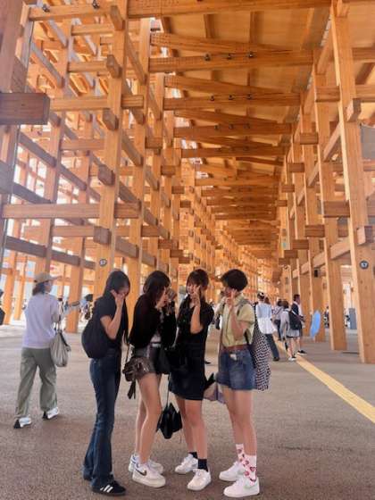 買う国の趣向を凝らしたパビリオンにて、文化の違いや表現の豊かさに触れている生徒や、三菱みらい館では他府県の高校生とグループを組み、「食のバリアフリー」をテーマに、探究活動を行った結果として、実際に作ったものを発表している生徒など、それぞれに多くの学びや気づきがありました。