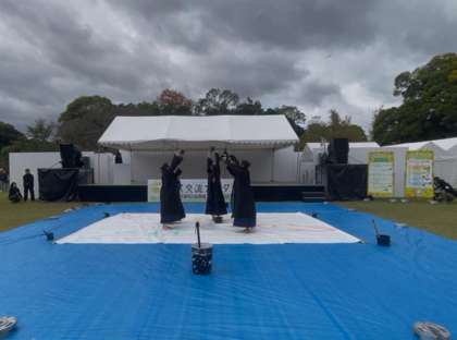 11月3日(月)京都府立植物園において、「令和7年度府民交流フェスタ」が実施され、本校書道部が書道パフォーマンスと書道ワークショップを実施しました。雨が降ったりやんだりしましたが、無事に書道パフォーマンスを実施することができました。