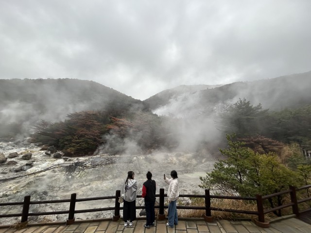 その後、雲仙地獄巡りを行いました。最初は硫黄の匂いに面食らっていましたが、剥き出しの岩肌や気泡と共に湧き出す温泉が織り成す光景に、生徒たちは目を奪われていました。「最初は地獄巡りかぁ…と思っていたが、思ったよりも楽しかった」「雨が降っていて霧も出ているが、逆に雰囲気が出ていい」といった感想が聞かれており、大変充実した時間となりました。