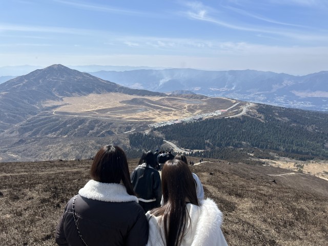 阿蘇火山博物館に到着すると、日差しが出ているにもかかわらず、気温は6℃程しかなく、「思っていたよりも寒い!」と肩をすくめている生徒もいました。そこからは、標高1300mの木島岳山頂を目指し、トレッキングを行いました。約900段の階段登りに苦悶の表情を浮かべていたのも束の間、山頂に近づくにつれて壮大に広がっていく景色に、その表情はすぐに明るくなりました。