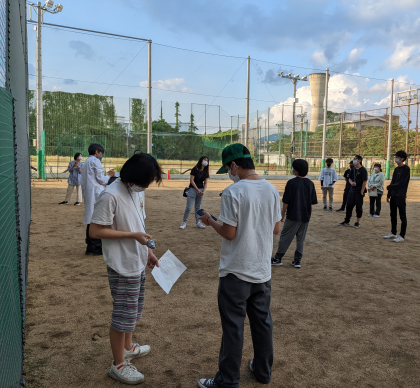 その時に重さの違う物体で落下時間が違うか同じになるかをまずはみんなで予想し、実際にそうなるかを実際に落としてみて見たり、落下にかかる時間をグラウンドにいる生徒がストップウォッチで計測し、教室に戻って平均時間から落下速度や重力加速度を計算します。