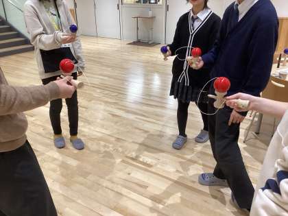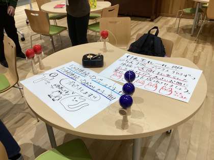 大会のルールは、5人のグループを組んで1人1回ずつ、けん玉の「大皿」という一番簡単な技を成功させることを条件に、5回連続で成功したらジュースをもう一杯おかわりできて、10回連続でお菓子がもう一つもらえるというスペシャルなもの。