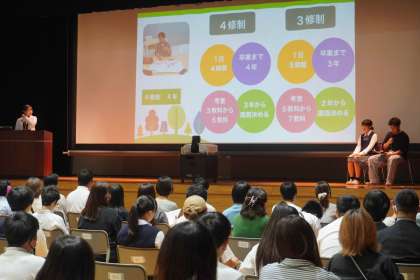 全体会では、代表生徒の受検体験や高校での学びの説明を行いました。彼らの経験に基づく言葉は、何よりの参考になると考えています。受検を考えている皆さんには、改めて彼らの言葉を振り返って、本校での学校生活のイメージに役立ててもらえればと思います。