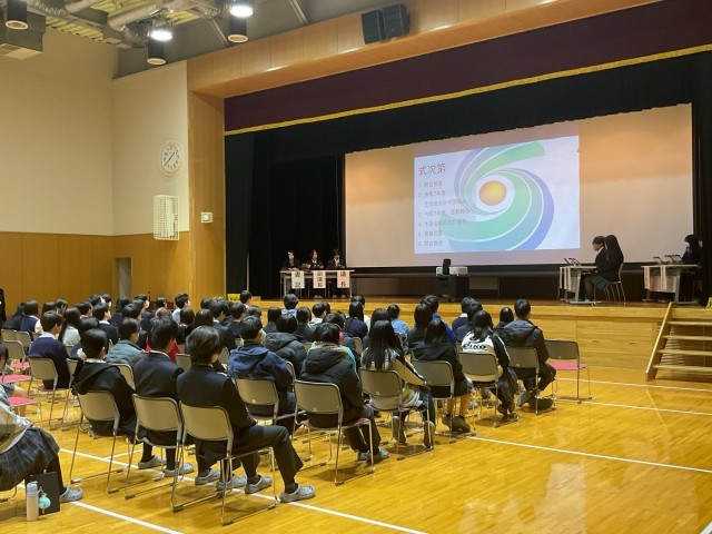 まずは生徒総会があり、会計部長から令和年度生徒会費中間報告、続いて生徒会長から「前途陽遥」のテーマを基に今年度の活動報告がありました。