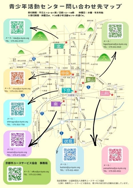 京都市内には、北、東山、中央、下京、南、伏見、山科の7つの地域に青少年活動センターがあります。いずれのセンターも水曜日が休館日で、平日と土曜日は10時から21時まで、日曜日と祝日は10時から18時まで開館しています。マップには各センターの連絡先やアクセス方法、QRコードが記載されていますので、自宅から通いやすい場所をぜひ探してみてください。