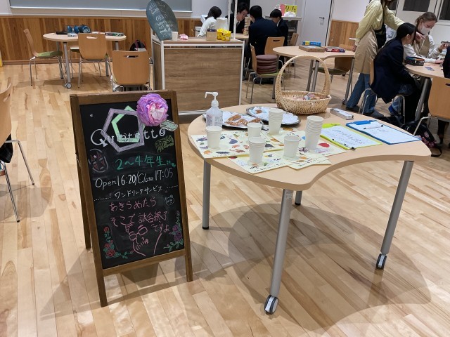 京都市ユースサービス協会の皆さんとテーブルを囲み、ジェンガやボードゲームで遊びました。ご用意していただいたお菓子をつまみながら楽しい時間を過ごしました。