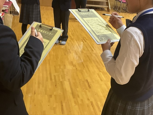 最初は緊張していた様子の生徒たちも、ユースの皆さんのあたたかいまなざしのもと、クラスで協力して、「バースデーチェーン」「写真合わせ」「共通点ビンゴ」に挑戦するなかで、自然とにこやかな表情に変わっていきました。制限時間内に課題をクリアすると大きな歓声がおこったり、楽しい時間を過ごすことができました。