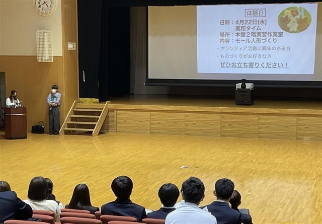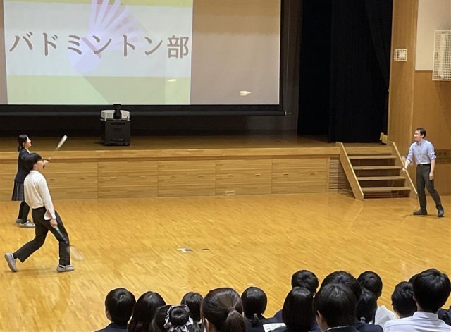1年生を中心に多くの生徒たちが見守るなか、活動の様子を動画で伝えたり、バドミントン部やバスケットボール部は実演を交えたりと、この日に向けて準備してきたことが披露されました。