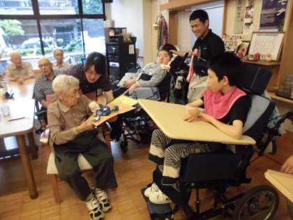 自己紹介の後,作品を渡しました。「きれいだねえ」「上手にできてるねえ」「うれしいねえ」等,温かい言葉をたくさんいただきました。